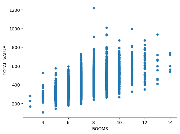 housing_df.plot.scatter(x="ROOMS",y="TOTAL_VALUE")