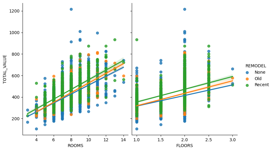 sns.pairplot(housing_df, x_vars=["ROOMS","FLOORS"], y_vars="TOTAL_VALUE", hue="REMODEL",height=5, aspect=.8, kind="reg")