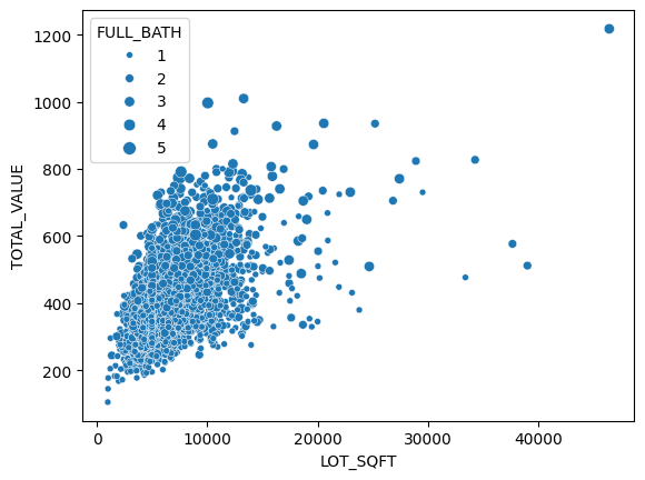 sns.scatterplot(x="LOT_SQFT",y="TOTAL_VALUE",size="FULL_BATH",data=housing_df)