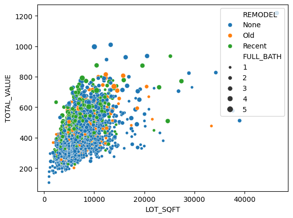 sns.scatterplot(x="LOT_SQFT",y="TOTAL_VALUE",size="FULL_BATH",hue="REMODEL",data=housing_df)