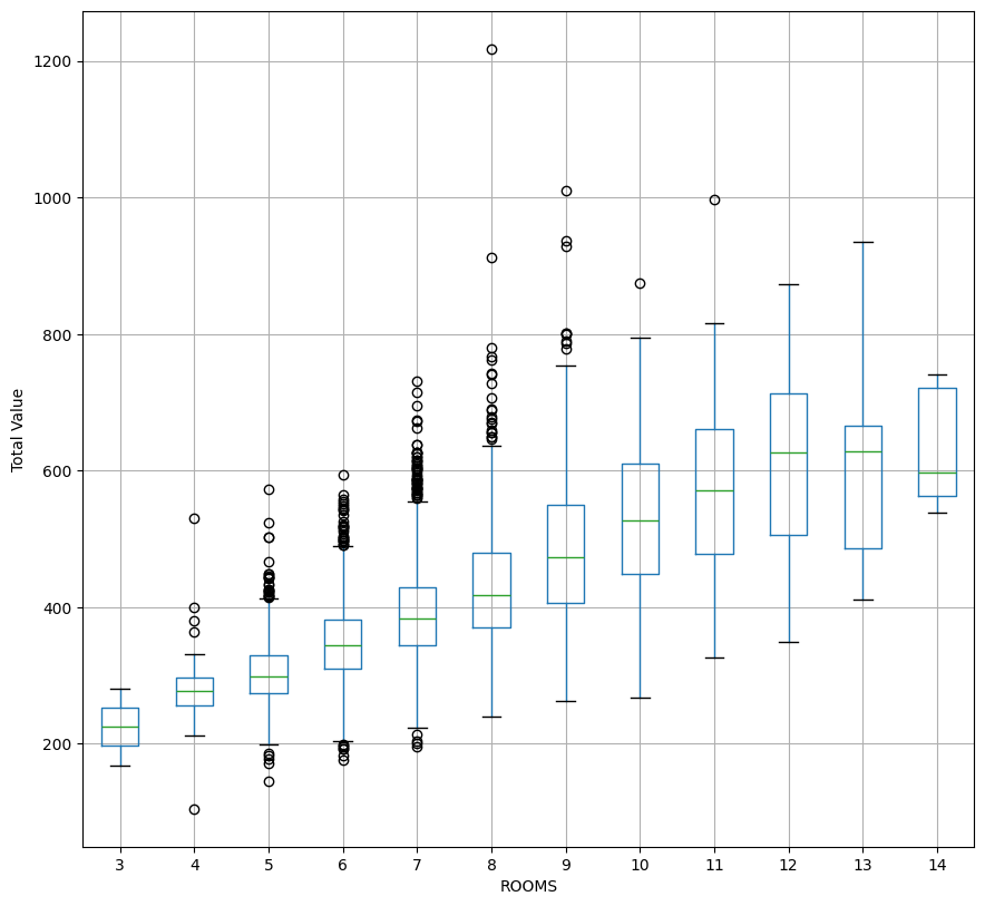 ax = housing_df.boxplot(column="TOTAL_VALUE",by="ROOMS", figsize=(10,10),grid=True)