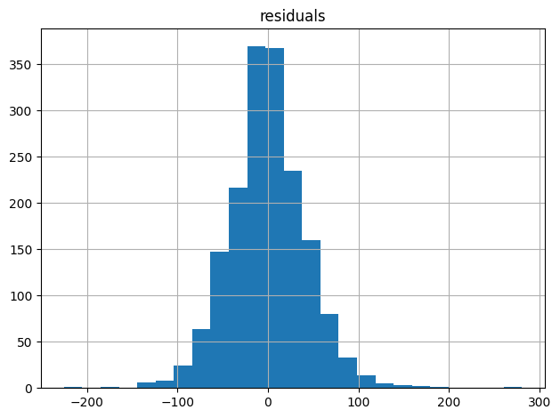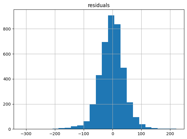ax = pd.DataFrame({"residuals":valid_residuals}).hist(bins=25)