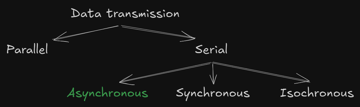 Data transmission can be categorized into two main types: Serial and Parallel. Serial communication, in particular, has several subtypes, including Asynchronous, Synchronous, and Isochronous. In this post, we’ll focus on UART (Universal Asynchronous Receiver-Transmitter), which is an asynchronous method of communication. Unlike synchronous communication, UART does not require devices to share the same clock cycles or be synchronized.