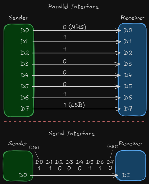 Parallel Transmission: Data is sent in groups of 8 bits (a byte) simultaneously over multiple channels. While faster, it is more complex and expensive due to the need for multiple communication lines.