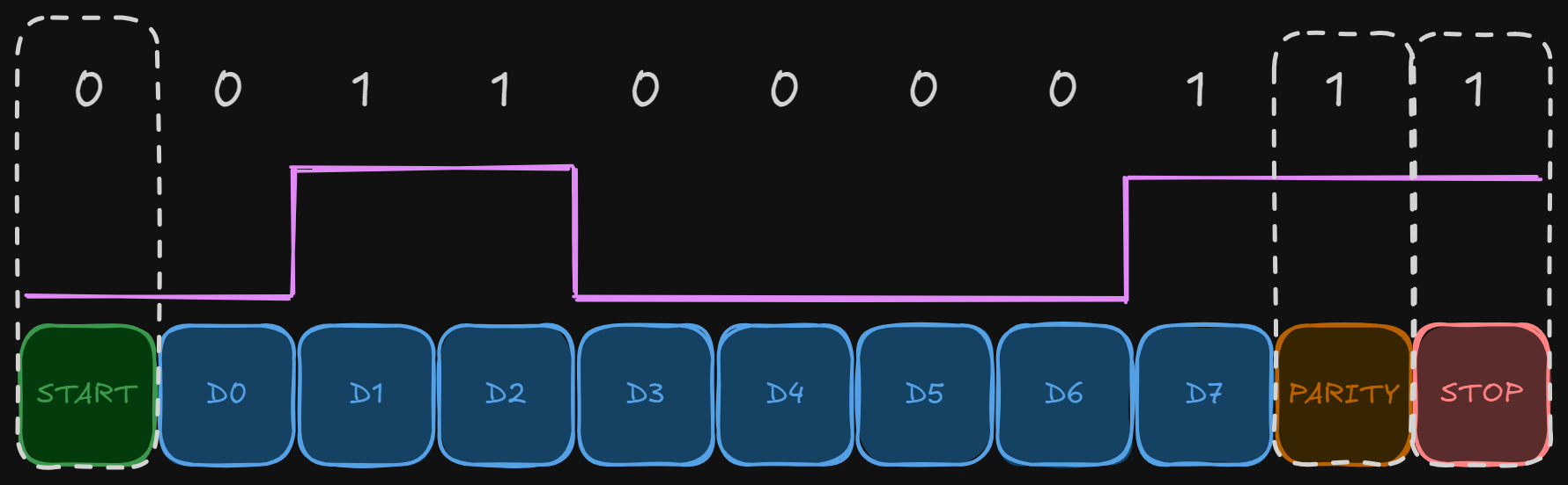 - Start Bit: A single bit (usually 0) that signals the start of a byte.